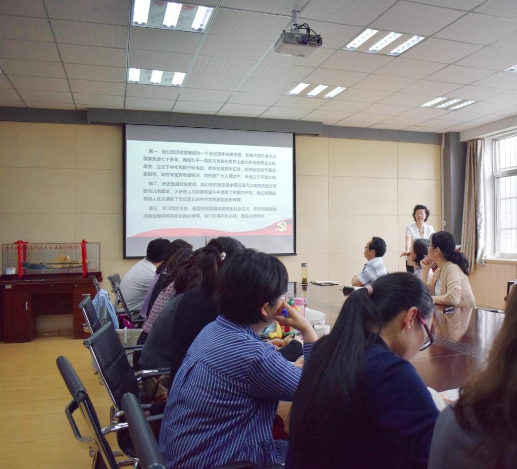 张淑华围绕《习近平总书记在全党党史学习教育动员大会上的讲话》中的重要内容,从九个方面全方位解读党史学习教育的重要意义;用“一、二、三、四”概括阐释了中国共产党苦难辉煌的百年历史;从中国共产党有不变的初心和使命、有科学的理论引领、有好的政治制度、有坚定不移的中国道路、有自我革命精神、有人民群众的巨大力量六个方面解读了中国共产党的成功之道。她强调,全体党员要继续增强党史学习教育的自觉性,学好党史必修课,持续推动党史学习教育往心里走、往深里走、往实里走,真正做到学史明理、学史增信、学史崇德、学史力行,不断从党的百年伟大奋斗历程中汲取推动学院学校发展的智慧和力量,激发推动学校“十四五”发展的动力和活力,党员同志要忠于岗位职责,践行初心使命,以昂扬姿态奋力开启全面建设社会主义现代化国家新征程,奋发有为做贡献,以优异成绩献礼党的百年华诞。