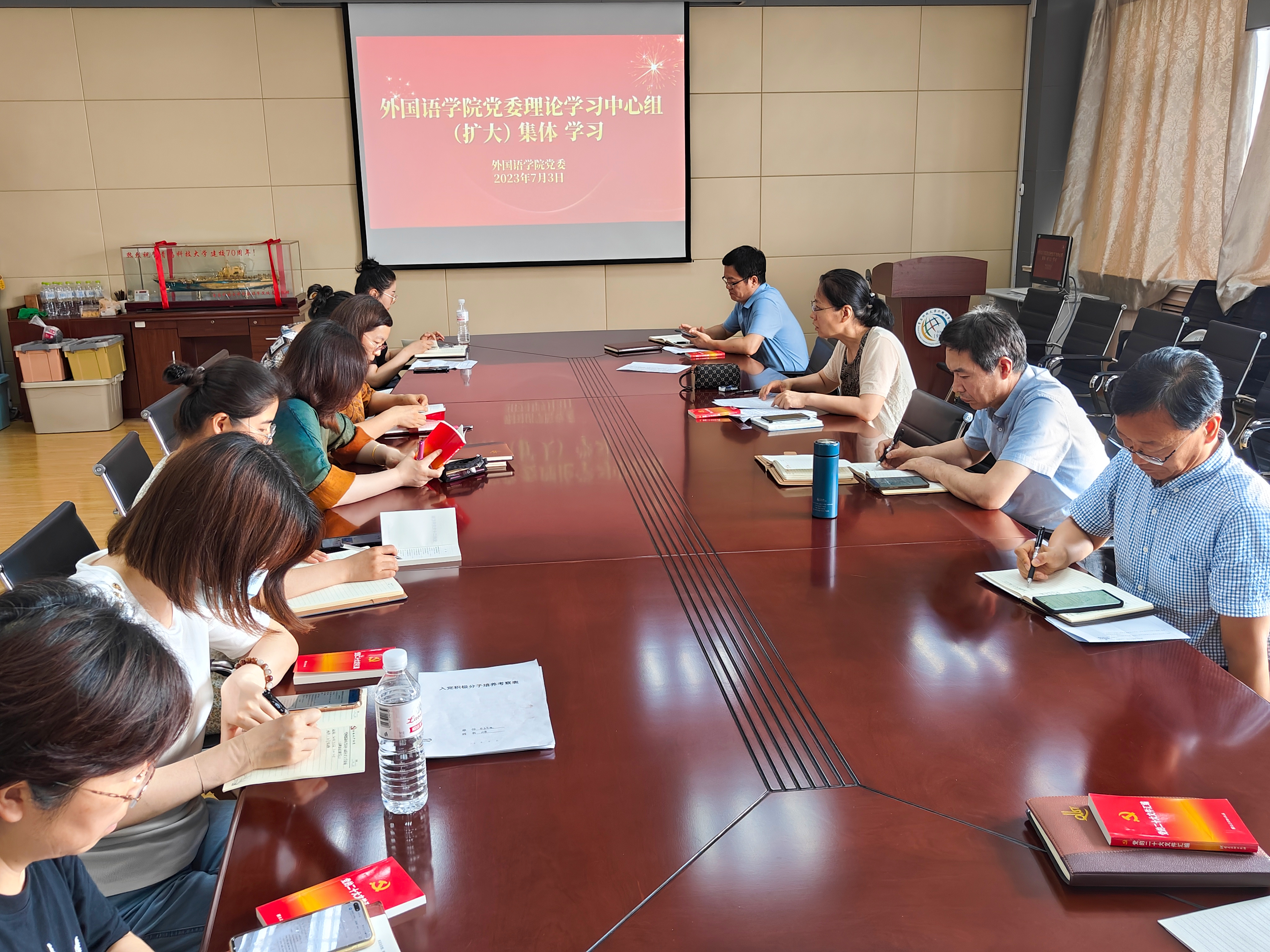在517会议室举行党委理论学习中心组(扩大)集体学习暨主题教育第三次专题学习。党委书记曲斌艳主持学习,党委委员、党支部书记、学工办主任和全体辅导员参加。