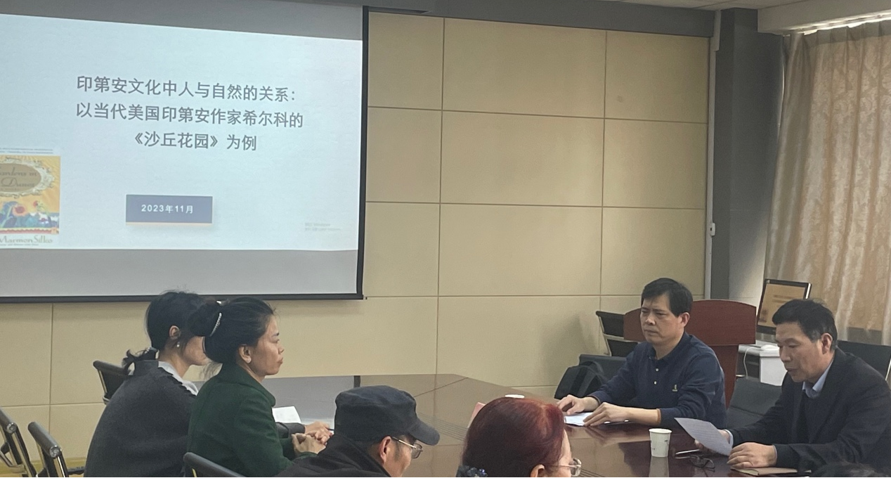 报告会上,生安锋教授以美国印第安当代女作家希尔科的小说《沙丘花园》为例,从人与自然的精神联系与物质联系两方面解析印第安传统文化中所蕴含的丰富的生态智慧。生安锋教授首先从作者生平以及创作背景入手,为大家普及了一些与印第安文化相关的知识以及印第安人的现状,进一步介绍了印第安人与自然的物质联系,如:印第安部落会以特定的与部落相关的动物作为自己的图腾;来自沙漠蜥蜴部落的族人尊重、保护、依赖于庇护他们的沙丘。同时又从人与自然的精神联系方面对该作品进行分析:大自然不仅为印第安人提供日常所需的衣食和庇护,更具疗治身心的功能,为他们带来精神的安慰、身份的认同以及灵魂的归宿。结合文本生教授还表达了自己对人与自然关系以及生态整体观的见解。生安锋教授机智幽默的讲解引人入胜,所传达的生态理念引人深思。最后,生安锋教授就一些问题与困惑与老师、同学们进行了深入的交流,现场学术氛围浓厚。