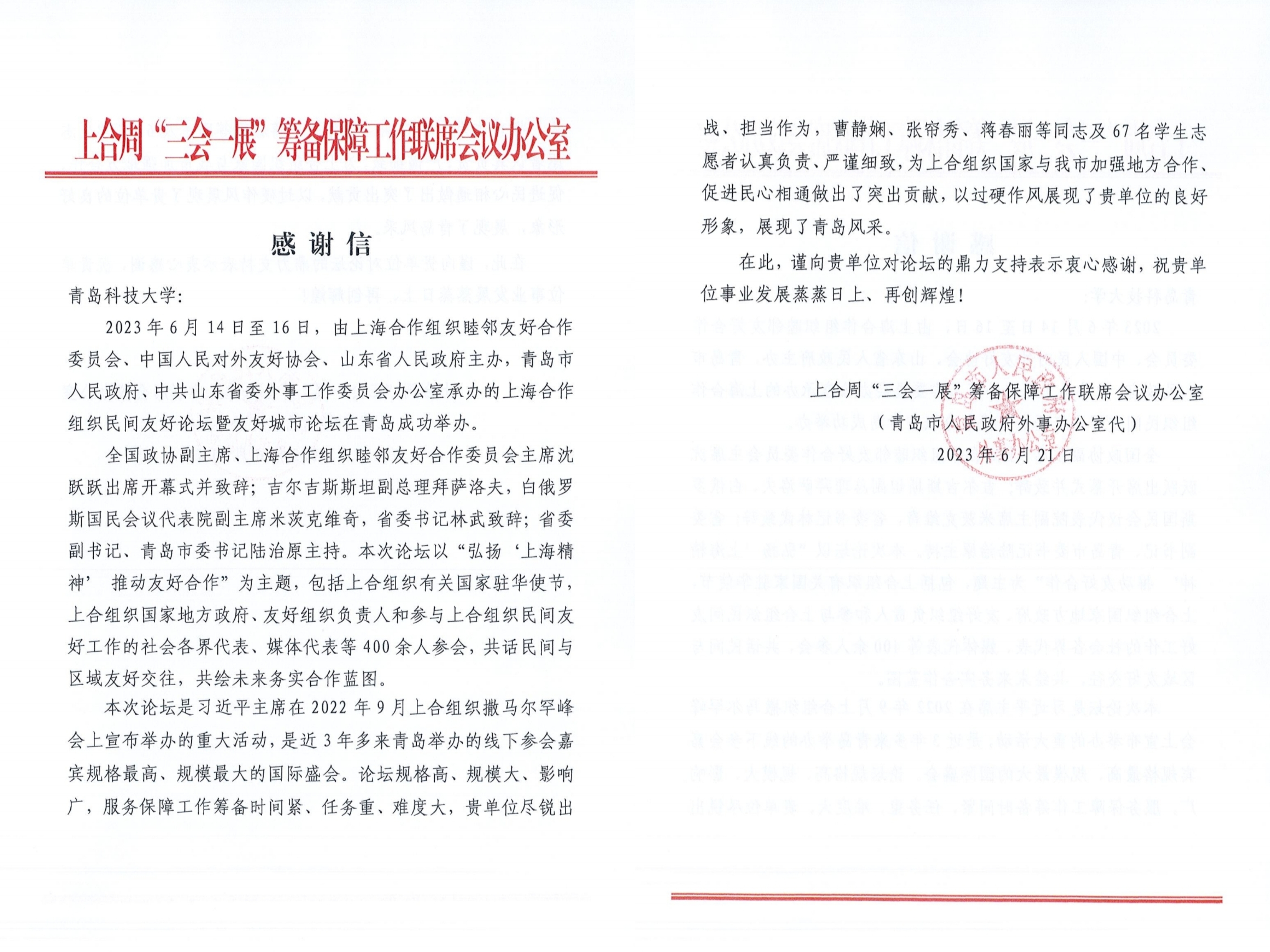 收到青岛市外事办感谢信,对学校给予上海合作组织民间友好论坛暨友好城市论坛的鼎力支持表示感谢,对bangumi