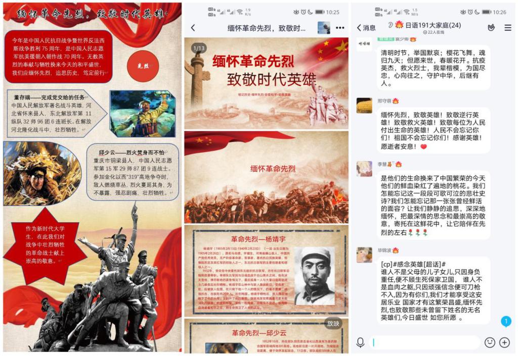 组织了“铭记历史,致敬英烈”主题团日活动。活动中,同学们以制作海报、讲述革命故事、展示时代英雄事迹、线上发表感想等形式致敬那些为国牺牲的英雄烈士,引起同学们强烈的精神共鸣,激发了同学们的爱国激情。