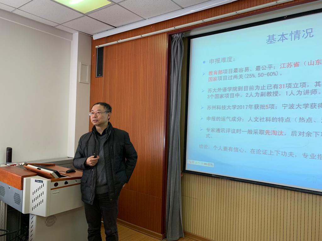 王军教授首先介绍了以苏州大学为例如何有效组织项目申报;其次讲解了个人项目申报过程中需特别留意的几个关键环节,包括如何选题(选题的几个基本原则)、如何论证、文献综述(包括总结研究的现状以及局限性)、研究意义(理论意义和应用价值)、研究内容(突出重点)、研究思路与研究方法、语言表达问题、格式规范、申报人如何避免项目申报初期就被淘汰,等等。此外,王教授还就如何有效产出科研成果与在座的青年教师分享了自己的成功经验,涉及如何阅读文献、如何做笔记、如何拟定论文写作提纲等令许多有年轻学者颇为头痛的问题。
