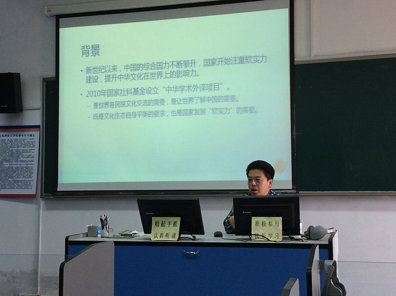研究生论坛,在语音室418做了题为“计算机辅助翻译在中国文化外译中的作用”的学术报告。报告由副院长吕耀中教授主持,姜德杰书记、尹洪山院长、康宁副院长及学院部分师生到场参加。