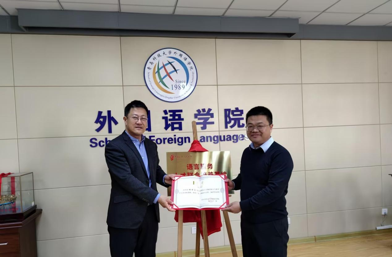 与译国译民集团校企合作座谈会暨授牌仪式在学院517会议室举行,院长王灏、副院长康宁、MTI教育中心主任房钰、译国译民集团董事长林世宋及译国译民集团山东分公司高校部总监陈淑玲参会。