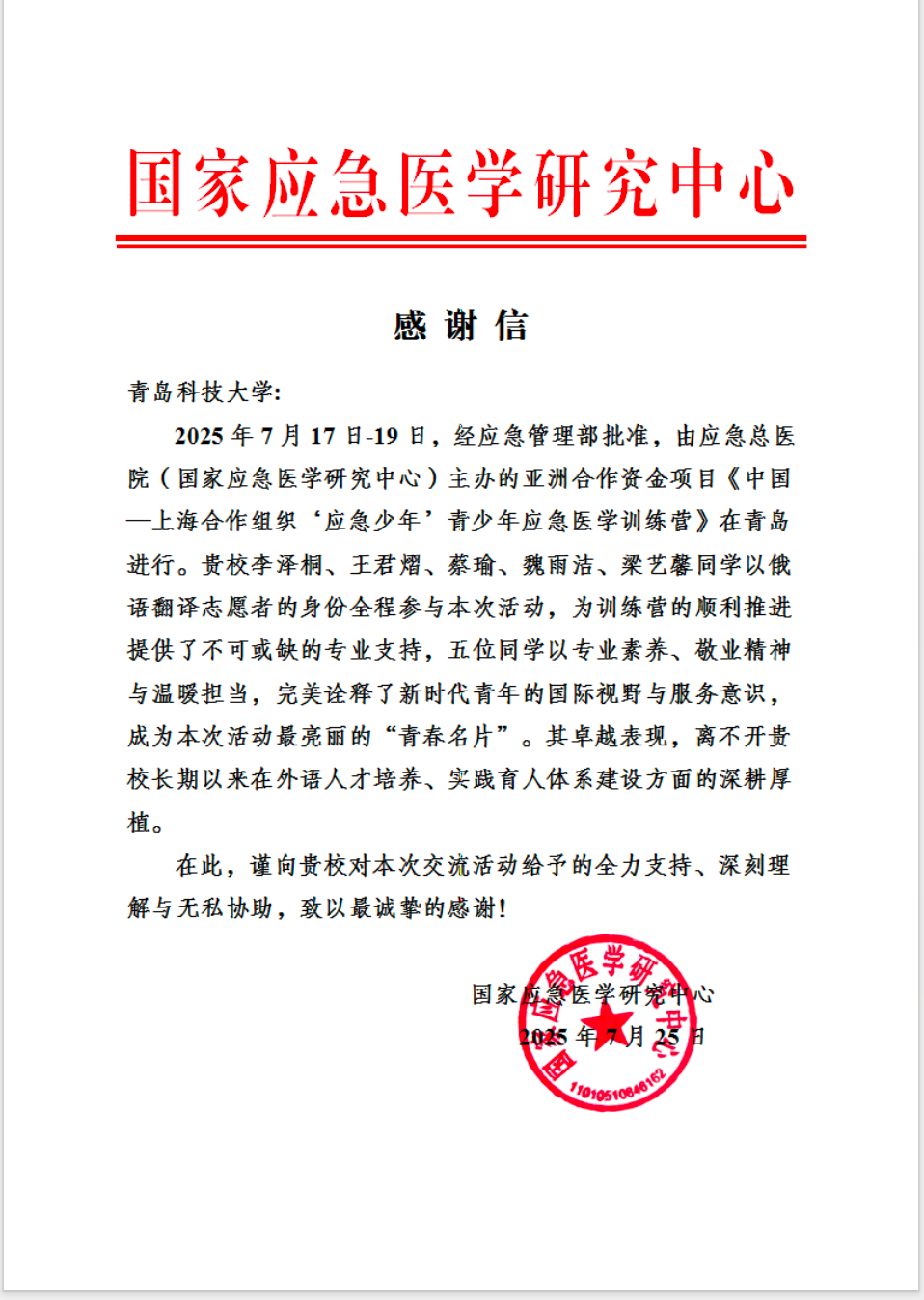 五位同学以俄语翻译志愿者的身份全程参与活动,他们凭借扎实的专业能力、高度的敬业精神和出色的团队协作,为训练营的顺利推进提供了重要支持。感谢信中特别提到,五位同学以“专业素养、敬业精神与温暖担当”成为活动中最亮丽的“青春名片”,展现了新时代青年的国际视野与服务意识。