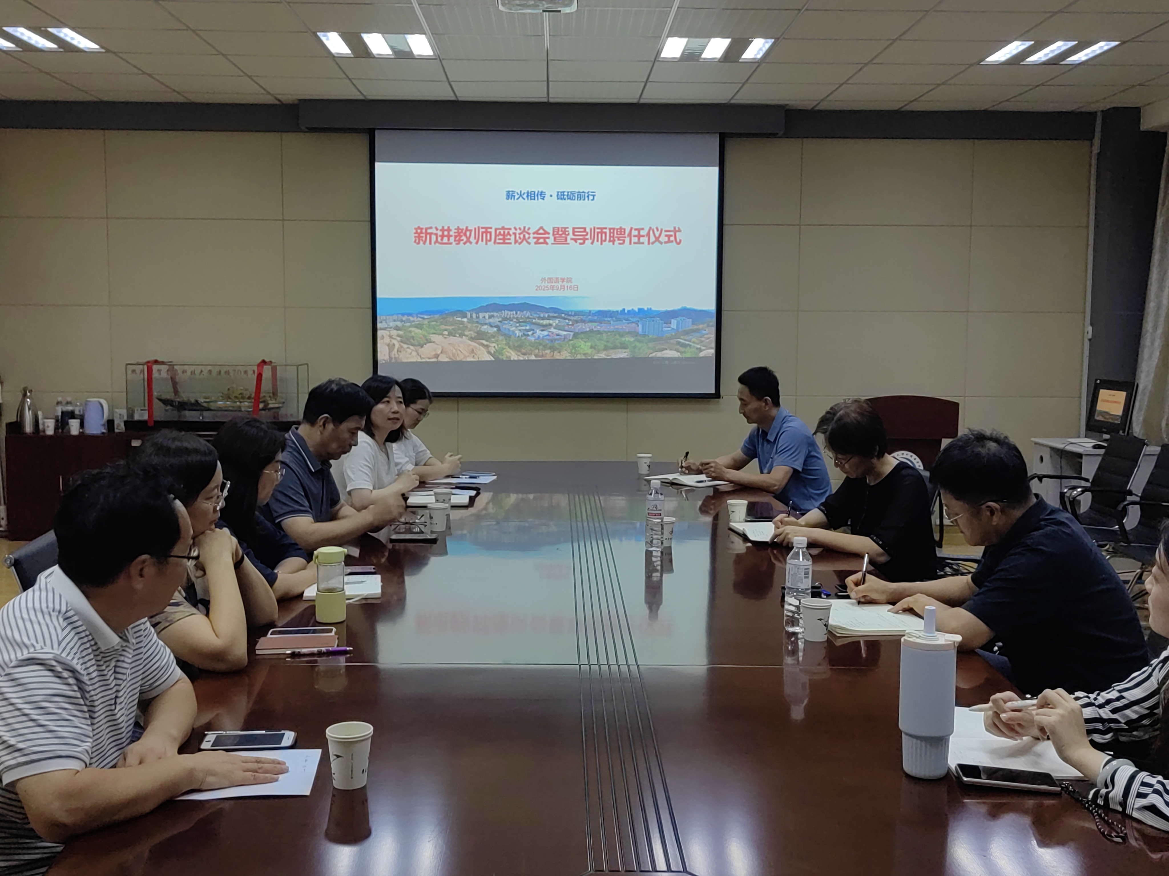 于2025年9月16日下午,在学院会议室举行以“薪火相传,砥砺前行”为主题的新进教师座谈会暨导师聘任仪式。学院党委书记曲斌艳、院长王灏、副院长康宁、副院长雷永亮、院长助理王丽、青年教师导师、新进青年教师参加会议。会议由院长助理巫莉丽主持。