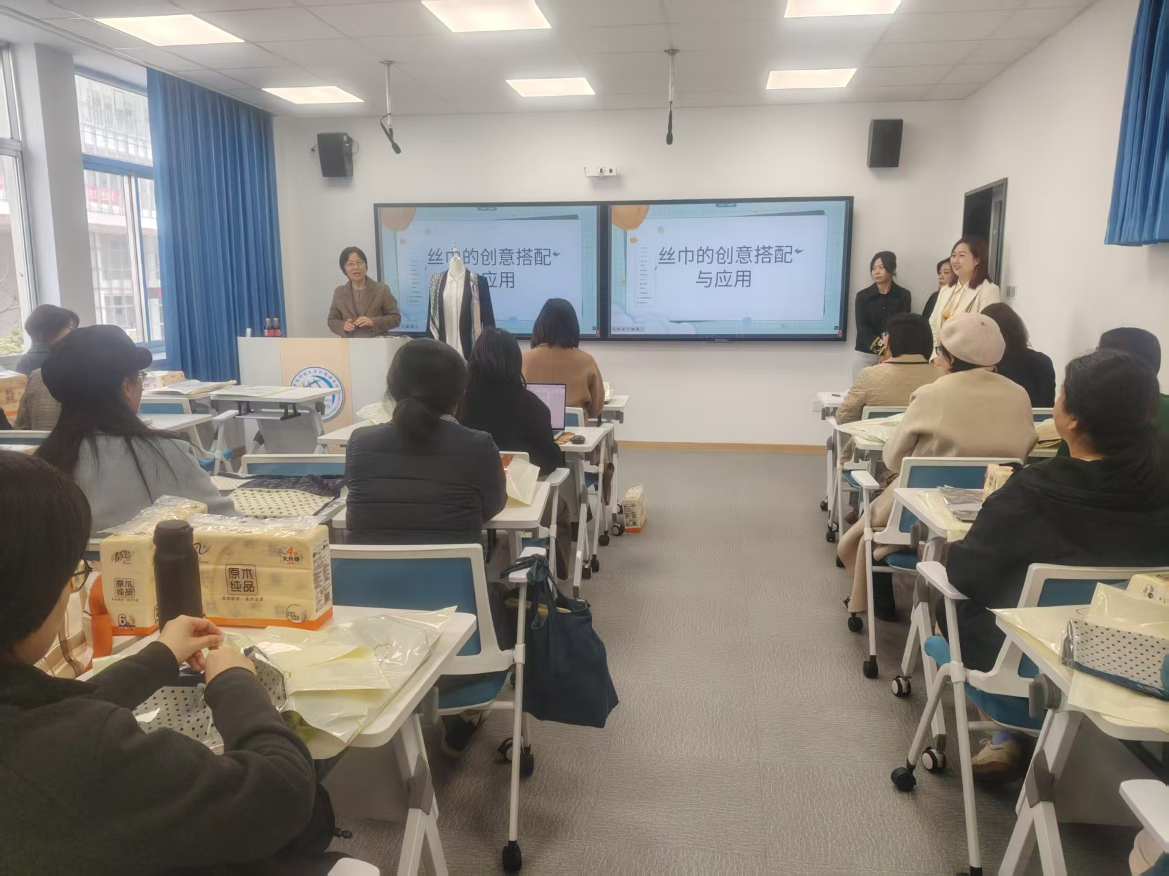 讲座伊始,党委书记曲斌艳代表学院向女教师送上节日问候,感谢大家在教学科研与管理服务岗位上的辛勤付出,并介绍了本次活动的初衷:希望通过丝巾搭配这一贴近生活的美学主题,帮助女教师们发现自身魅力,以更优雅自信的姿态拥抱工作与生活。