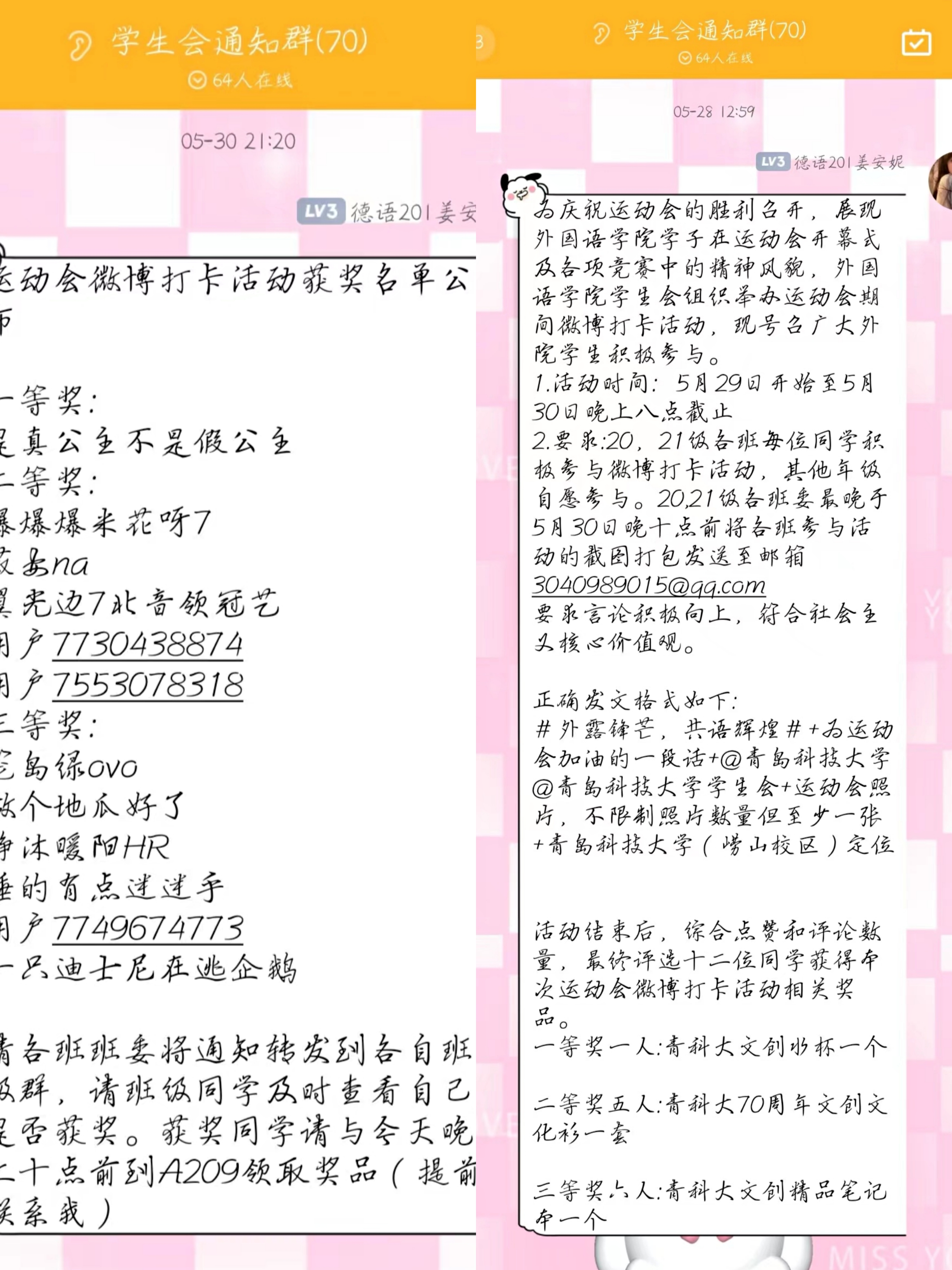 此次打卡活动于5月30日结束,微博平台显示,共有14.8万阅读次数,164讨论次数,原创人数131人。综合点赞和评论数量,最终评选出了十二位同学获得本次运动会微博打卡活动相关奖品。