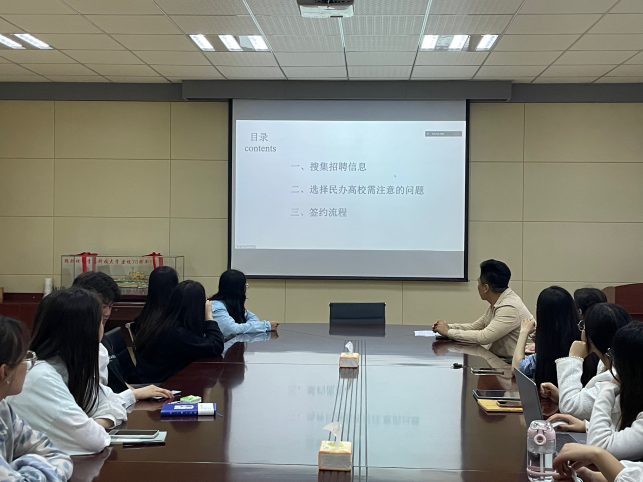 第一位进行经验分享的是高风,现已签约齐鲁理工学院,任基础教学部高级教师。她从以下三个方面就如何准备高校教师招聘考试进行了分析:一是如何搜集招聘信息,二是选择高校的注意事项,三是签约的具体流程。高风同学的热心讲解帮助同学们弥补了信息差,使得同学们能够更加全面详细地了解高校教师招聘的相关信息,为同学们指明了道路。