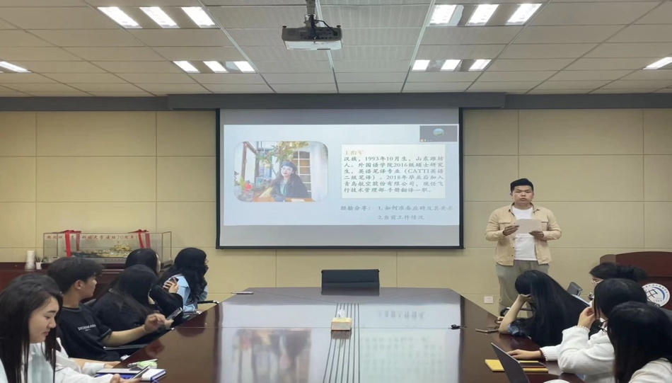 第三位分享人王治军,毕业后入职青岛航空股份有限公司,担任飞行技术部-手册翻译一职。她从在校学习、就业择业、当前岗位标准以及工作经验分享四个方面进行了详细的经验分享,表示无论是在工作还是生活中,都要真诚谦逊,勇敢大方,保持不断学习积极学习的热情,敢于试错,把握机会。同时还对同学们发出了真挚的祝福,希望同学们都能找到理想工作,过上充实生活。