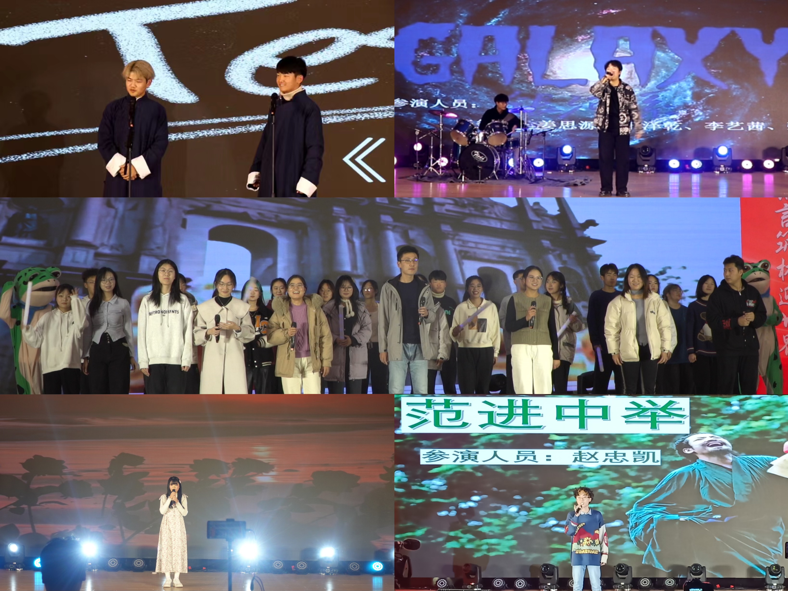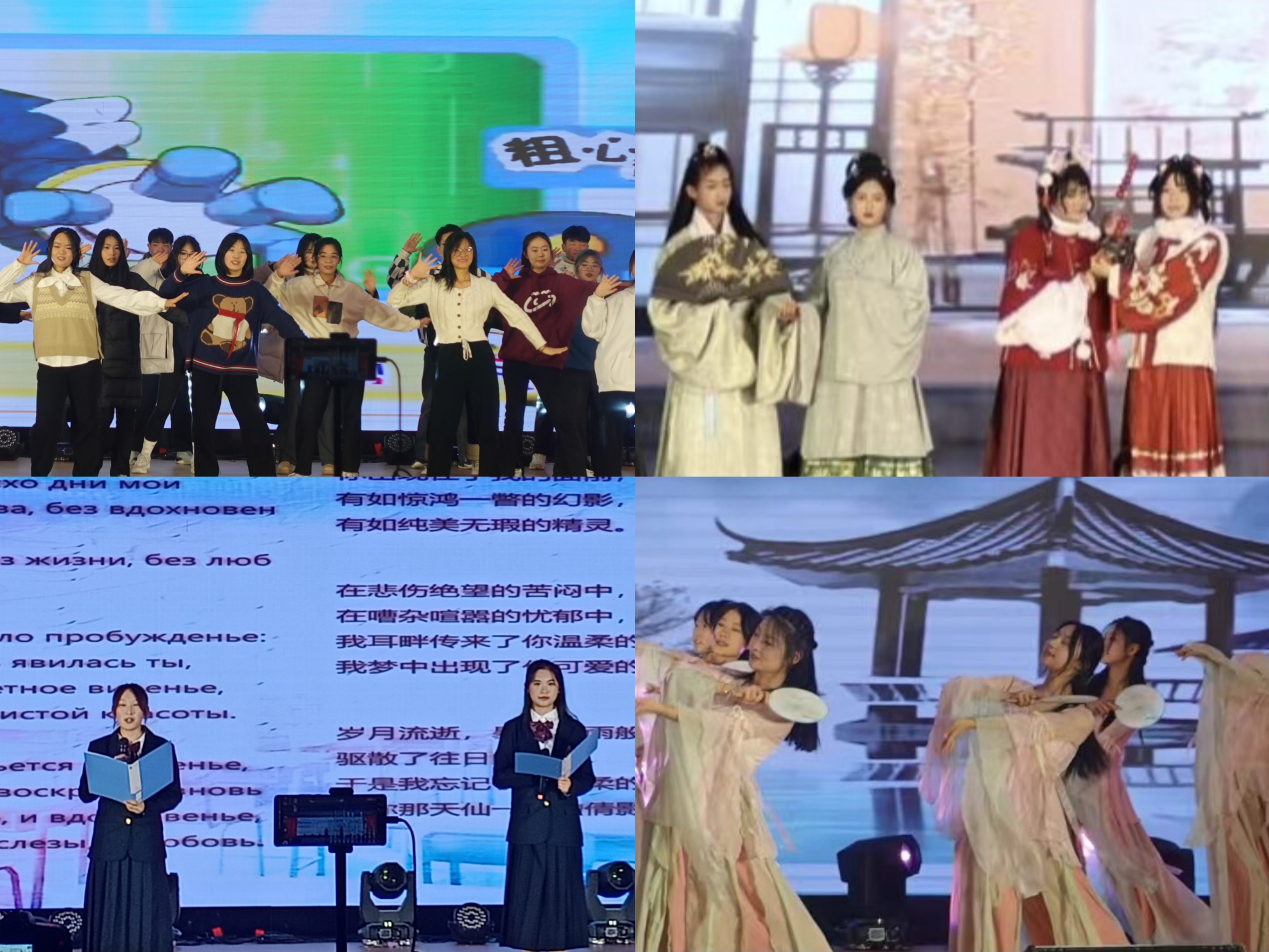 第二篇章,由外国语学生会骨干带来的舞蹈《开心向前飞》和《我乘着风飞过来》展现出外院学子青春、活力的一面。大艺团带来的中国舞《入画江南》,摇曳的舞姿柔情如水,令人陶醉。相声节目《他是个卷王》,节目以诙谐的语调围绕“卷”字上演,呼吁着同学们摆脱内卷,良性竞争。《等你下课》的歌曲响起,我们的校园青春旋律也缓缓奏出。俄语朗诵《我记得那美秒的一瞬》,让人想起人生中那令人难忘的每个瞬间。歌曲《范进中举》,变化的曲调和饱含深意的歌词,句句都唱进了观众的心里。吉他爱好者协会带来的吉他演奏《奇迹再现》《我的未来式》《凄美地》彰显青春激情,把大家带入一个精彩纷呈的世界。汉服走秀《清平调》气势宏大,展示华服之美,将中国传统文化的博大精深体现的淋漓尽致。歌曲串烧《在爱的回归线》《不要忘记我爱你》《天外来物》《仰望星空》中,外院学子用动人歌声,展现了属于外院人的年轻活力与青春风采。晚会在学院团委老师以及学生会主席团带来的歌曲《相亲相爱》中划上完美的句号。