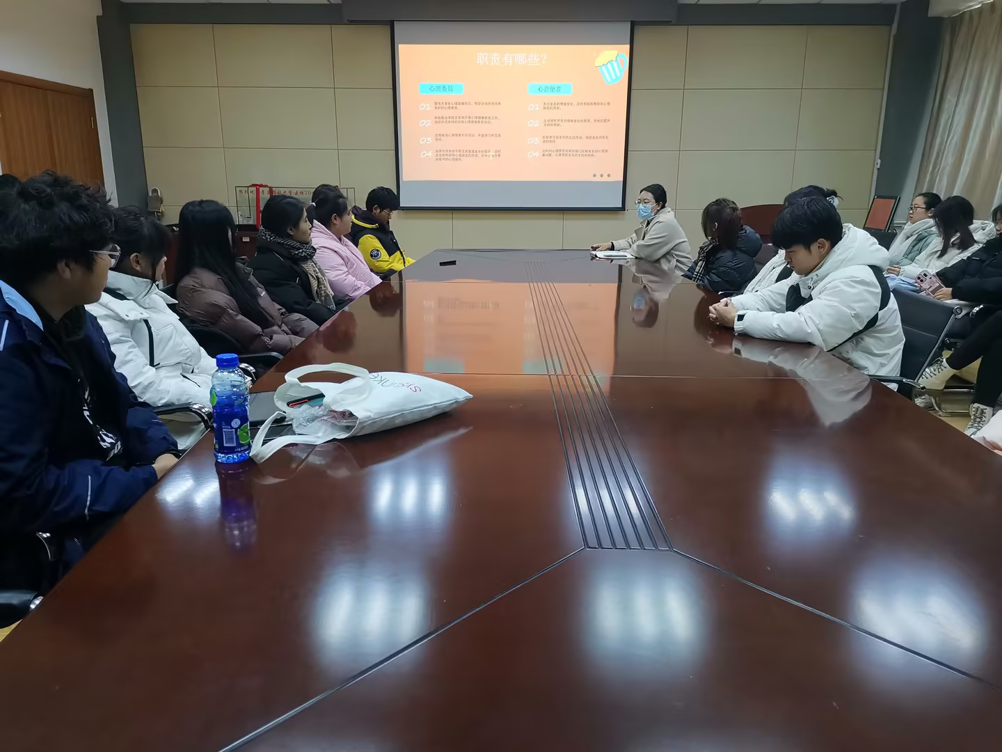 临近期末考试周,刘妍君老师讲到了心理工作的重要性及心理委员、心音使者工作职责,涉及到全体学生的安全稳定,需要时刻关注班级同学的心理健康状态,同时也提醒同学们在工作中要尊重他人隐私,学会倾听、理解、关心和支持他人,帮助同学们疏导心理情绪。特别提到大一新生面对初次考试以及大四学生面临考研就业时间节点,更要调试好心理状态,要实时关心关注同学们。