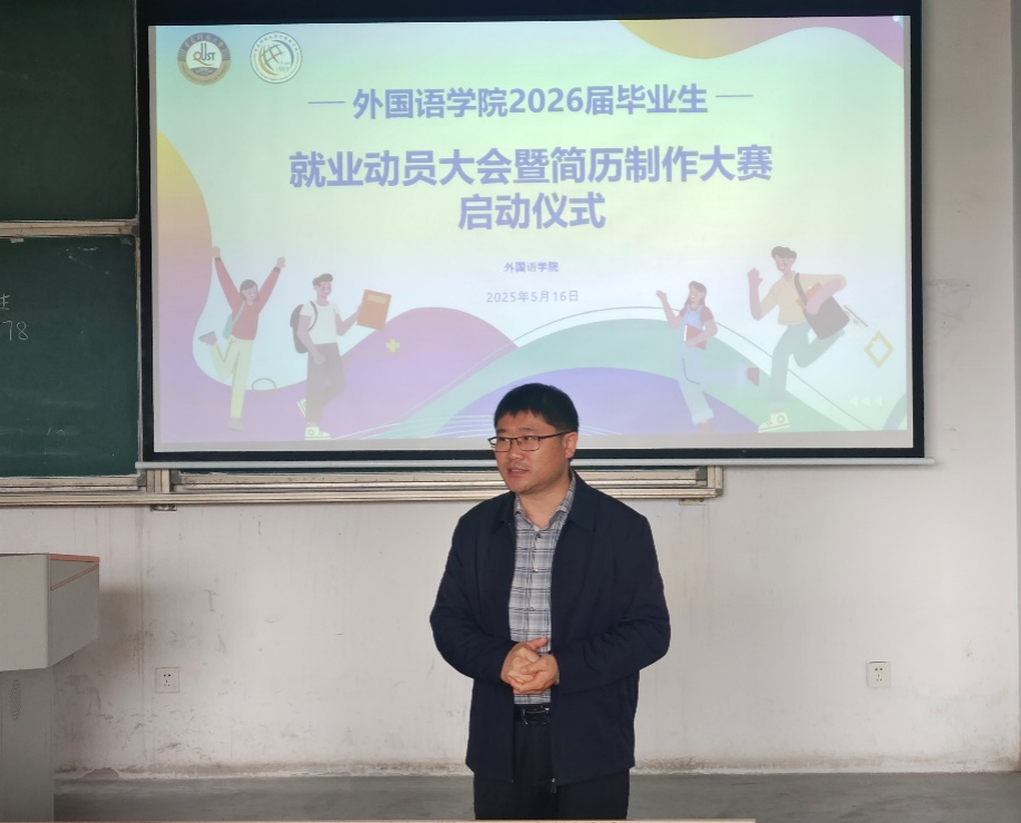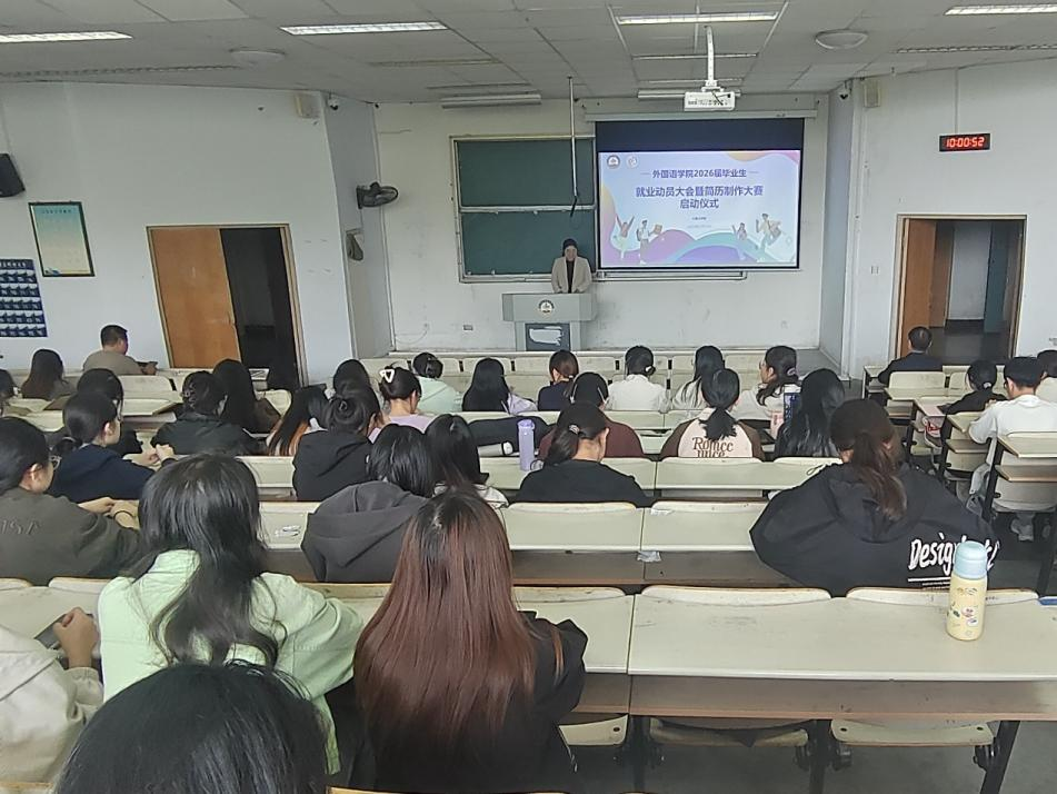 于5月16日上午举行2026届毕业生就业动员大会暨简历设计大赛启动仪式。学院党委副书记兼副院长马寒、辅导员马耀青、英科医疗、英科再生和新东方等企业代表及2025届毕业生代表参加活动。