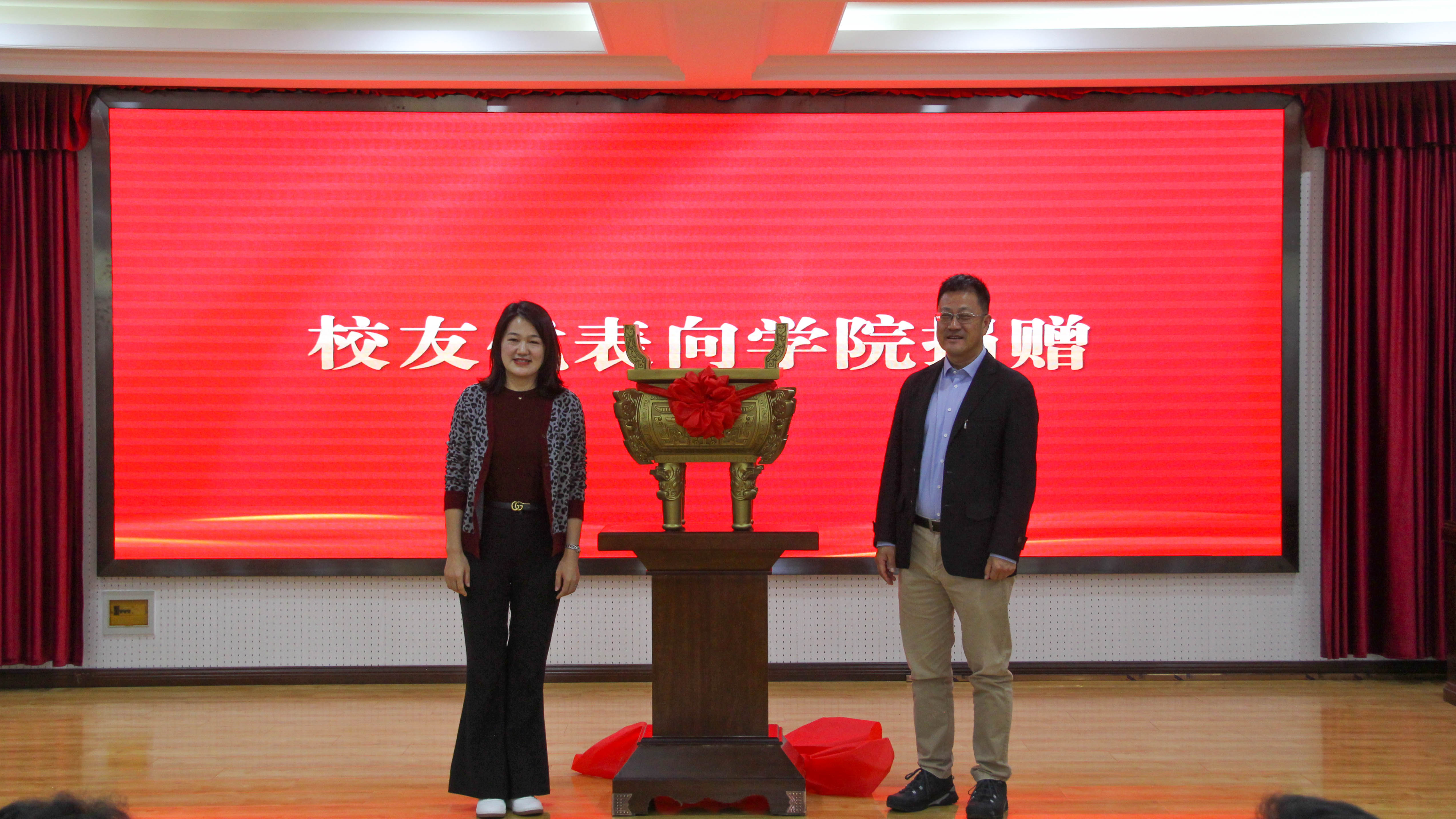2007届校友、北京天成农业发展有限公司董事长、学院校友会新任常务副会长代表程永志致辞。程永志回忆了自己成长、创业历程,表达了对学院教育培养的感激之情,提出了校友会未来工作计划。校友捐赠仪式上,日本语NAT-TEST中国考试中心CEO、校友安晓东向学院捐赠鼎盛千秋。